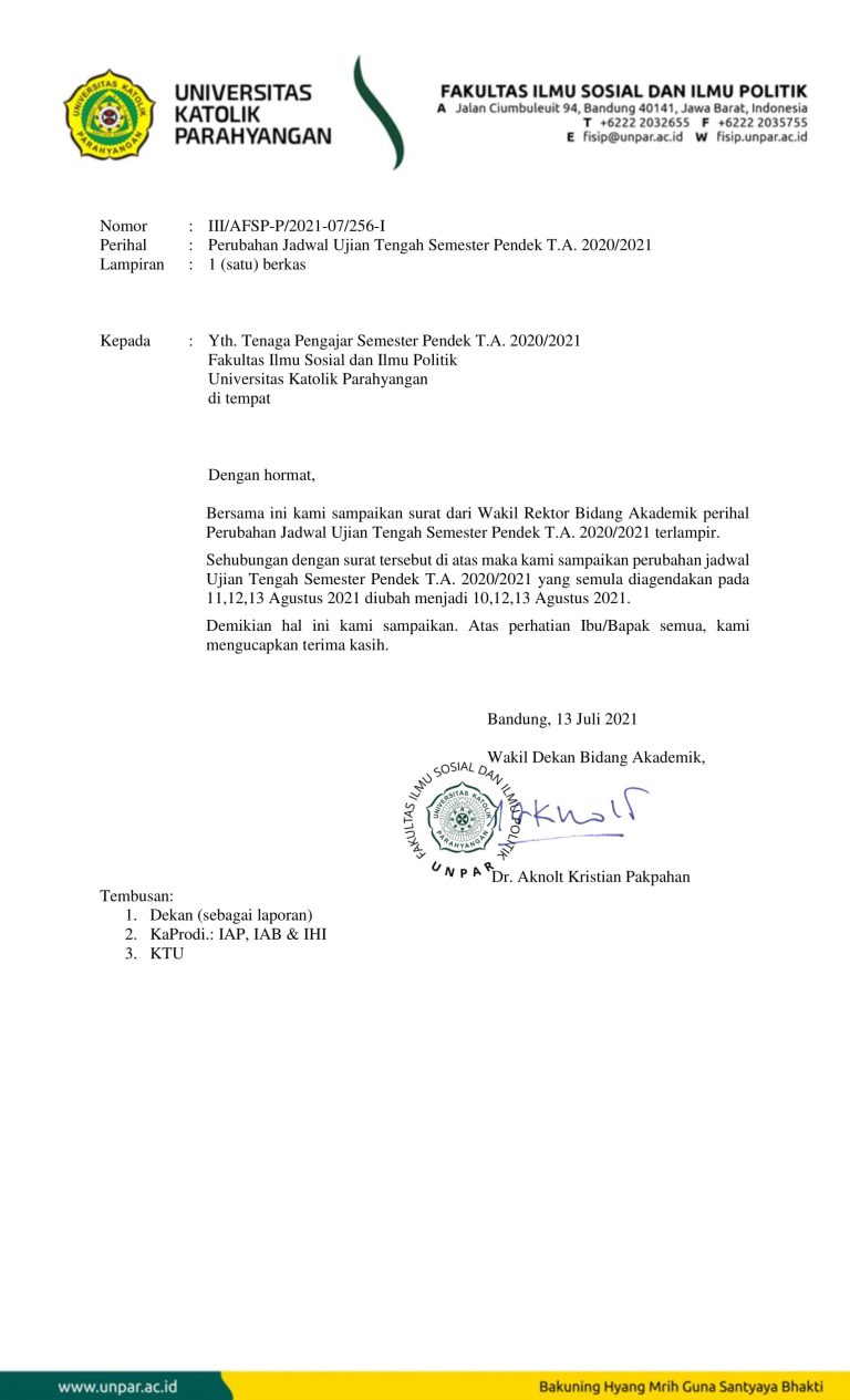 - Masa Ujian Tengah Semester (UTS) SP 2020/2021 akan berlangsung pada Kamis-Jumat, 12-13 Agustus 2021 sementara UTS Mata kuliah MKU pada Selasa, 10 Agustus 2021. Sementara jadwal Ujian Akhir Semester (UAS) SP 2020/2021 akan dilakukan pada Kamis-Jumat, 9-10 September 2021 sementara UAS MK MKU pada Rabu, 8 September 2021. Pengumuman Nilai Akhir (NA) adalah Jumat 24 September 2021.